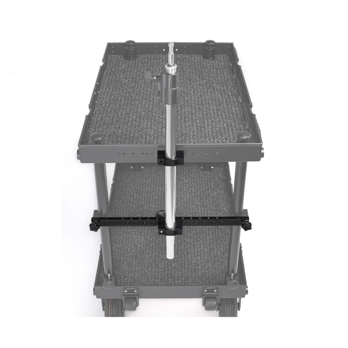 Additional 3/8 ’’ threaded holes allows you to mount photo/video accessories. The system must be mounted on the narrow side of the cart, where additional small transport wheels are. You don’t have to remove the crossbar when you’re folding adicam cart.