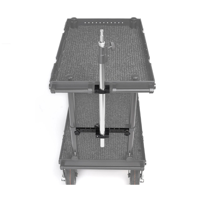 Additional 3/8 ’’ threaded holes allows you to mount some photo/video accessories. The system must be mounted on the narrow side of the cart, where swivel wheels/hand grip is. You don’t have to remove the crossbar when you’re folding adicam cart.