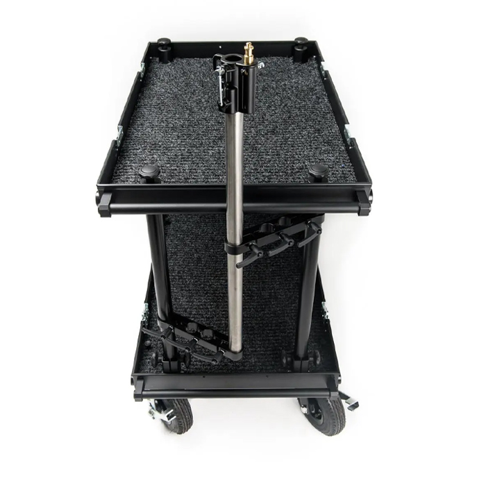 In case of heavy equipment, we recommend adapting it near the center of the trolley so that it does not overturn. The best solution for adapting/ installing is presented on the attached photos – on the swivel wheels/narrow side of the trolley. Using the steadicam, we recommend fixing on both legs.