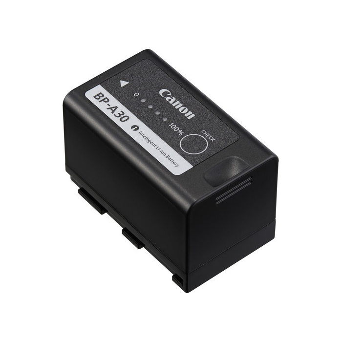 The Canon BP-A30 Battery Pack for C500 Mark II, C300 Mark III, C300 Mark II, C200, and C200B battery pack mounts on your camera, providing 45 watt-hours of power.