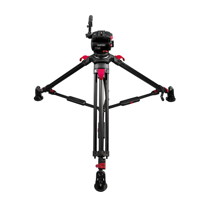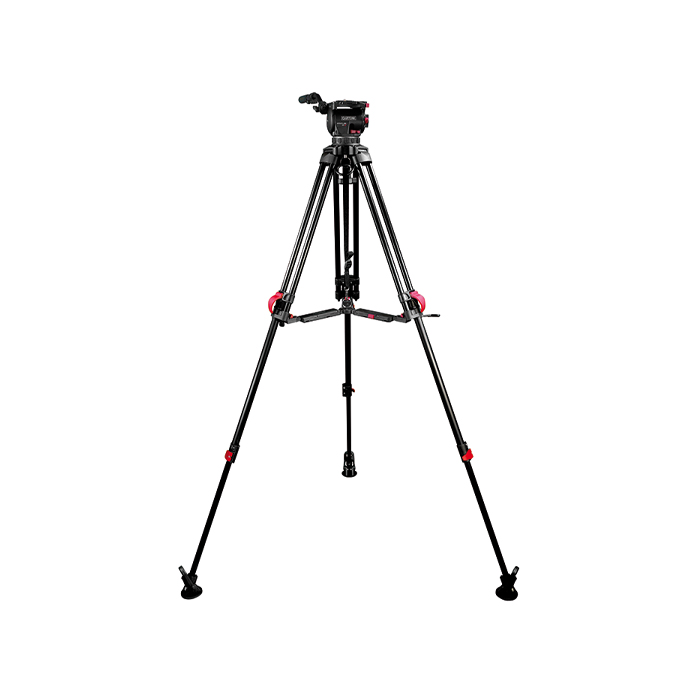 Focus 10 Fluid Head assembled with Red Lock Aluminum Tripod, Mid-level Smart Lock spreader, rubber feet and soft bag.