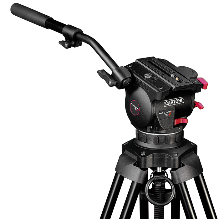 Extremely compact and lightweight the Focus 10 fluid head comes equipped with a quick release sliding camera plate, illuminated spirit level, user-friendly red levers and telescopic pan bar. Its tilting range is +/- 90° with perfect response throughout the entire tilt range.