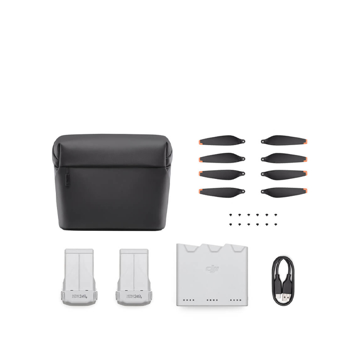 DJI Mini 3 Pro Fly More Kit includes two Intelligent Flight Batteries, a Two-Way Charging Hub, data cable, shoulder bag, spare propellers, and screws, providing comprehensive support for your aerial photography experience.