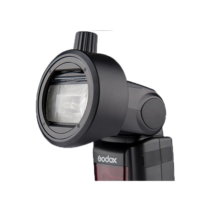 Attaching quickly via a thumbscrew, the Round Head Magnetic Modifier Adapter from Godox is the base component of a magnetic system that attaches simply and quickly to square-shaped speedlights from Godox, Nikon, Canon, and Sony. The modifier holds your speedlight securely by employing texturized rubber on its top and bottom. Separately available accessories such as barndoors, dome, honeycomb grid, snoot, bounce card, and filters attach quickly to the front of the adapter via magnets.
