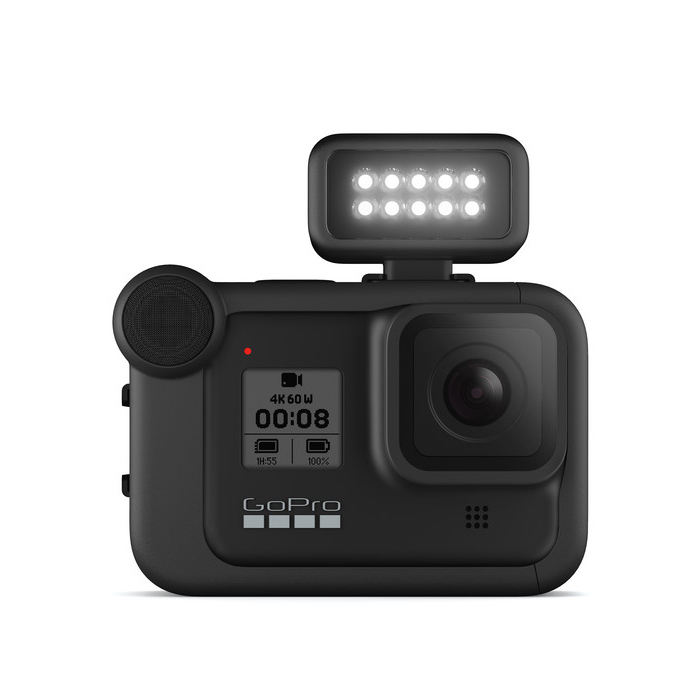 Like the HERO Black, the dedicated GoPro Light Mod is ultracompact and powerful, and it's waterproof down to 33'. It's designed to attach to the separately sold GoPro Media Mod for HERO 9 Black, HERO 10 Black, HERO 11 Black and HERO 12 Black, which is an external frame with shoe mounts and other features. The light can be attached on the top or side of the Media Mod, securing into one of the shoe mounts. Alternatively, it can be attached on various optional off-camera shoe mounts as a standalone light with GoPro mount. The light features a 5000K daylight color temperature and 90+ CRI. It allows you to illuminate your subject with wide, smooth, and even light. A diffuser is also included for softening the light output.