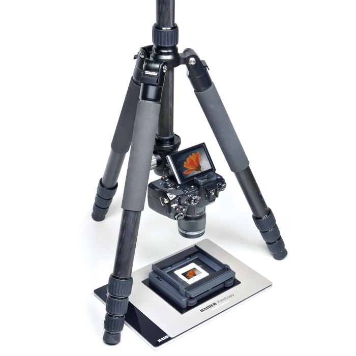 Stable holding device for the exact positioning of slides and negatives of various formats during digitization with a camera mounted to a copy stand or tripod. For use on light boxes.