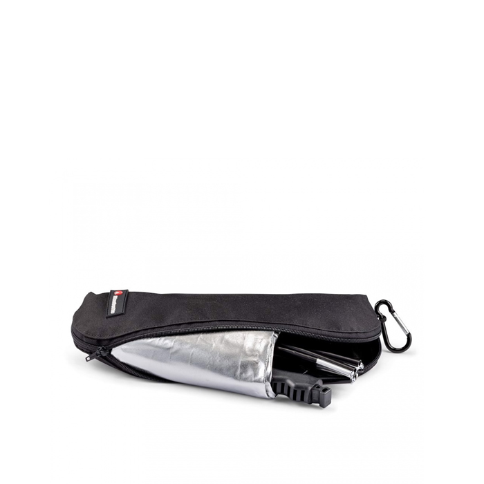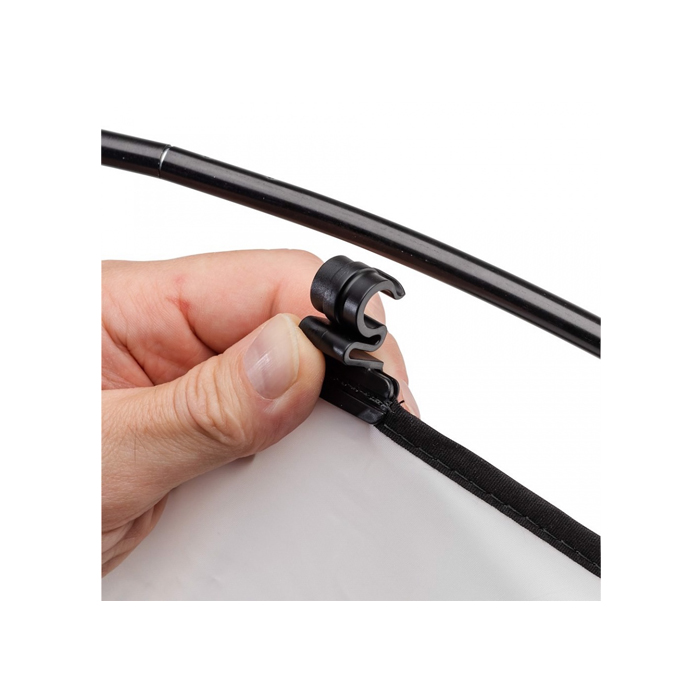 The rigid frame of the HaloCompact Plus is constructed using Manfrotto’s RapidExoframe™ technology. The collapsible lightweight aluminium frame quickly slots together and the reflector or diffuser fabric cover simply clips onto the frame using a newly designed ergonomic clip, offering more flex during assembly to make set up even easier. The cleverly designed RapidExoFrame™ construction allows the frame to breakdown into small multiple sections and along with the folded cover, packs into a carry case measuring only 29.5cm x 10.5cm x 6cm (11.6” x 4.1” x 2.3”) weighing only 450g (15.8oz).