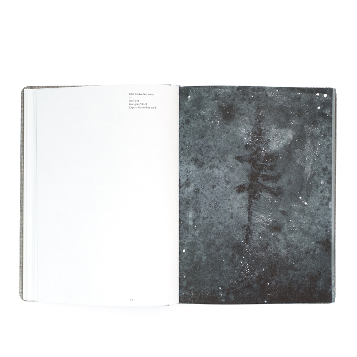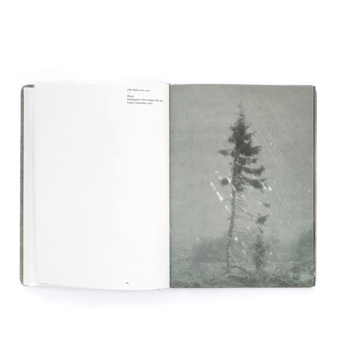 The tree, Old Tjikko, stands in a deserted landscape on a mountainside in Dalarna, Sweden, and is considered to be the oldest tree in the world with its impressive age of 9,600 years. A single photographic negative of this exceptional spruce has become the many different photographs in this book. By exposing the same image onto 97 different types of aged analogue light-sensitive photo papers – some dating back as far as the 1940’s – Nicolai Howalt has in Old Tjikko created a book, where the unpredictability of the long expired photographic papers has become an integral and dynamic part of each image.