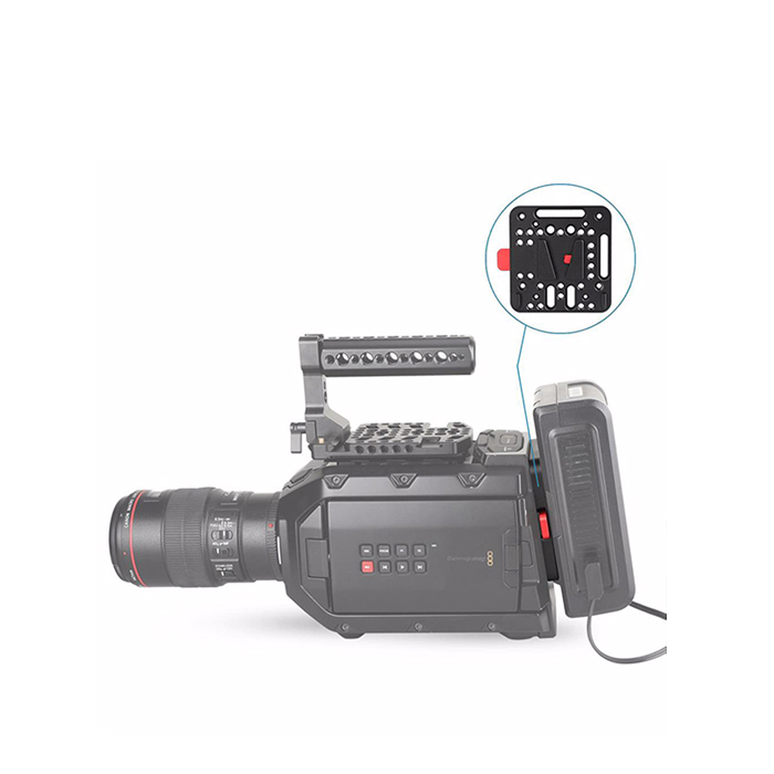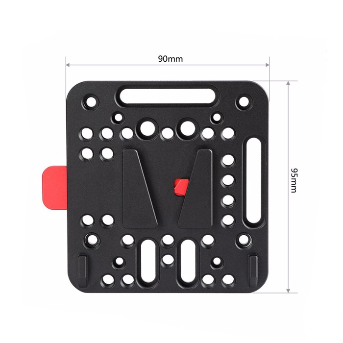 SmallRig V-Lock Assembly Kit 1846 is a quick release set based on the standard V-Lock. It comes with a Female V-Dock and a Male V-Lock. There are multiple mounting holes and grooves on the Female V-Dock, and you can attach this assembly directly to a SmallRig camera cage kit, SmallRig monitor frame, or SmallRig shoulder pad mount. Besides, you can mount this assembly kit to SmallRig 25mm rod clamp 1860 which is designed for DJI Ronin M/MX; with this setup, you can put your V-Mount battery on top of the Ronin to power all the accessories, which minimizes camera weight on gimbals. The two integrated protruding portions prevent it from twisting when the V-Mount battery attached. The V-Lock with three M3 holes can be used as a replacement of the original V-Lock comes with the V-Mount battery.
