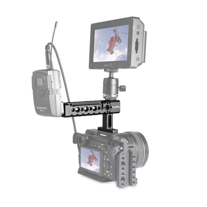 SmallRig 1984 Universal Handle is a top mount handle, it bolts on to two 1/4’’-20 holes spaced 36mm apart center for secure camera carrying. There are two shoe mounts on the top and at the back for attaching cameras lights and microphones. Accessories can be attached using the multiple 1/4’’-20 and 3/8’’-16 holes and two Arri standard accessory mount.