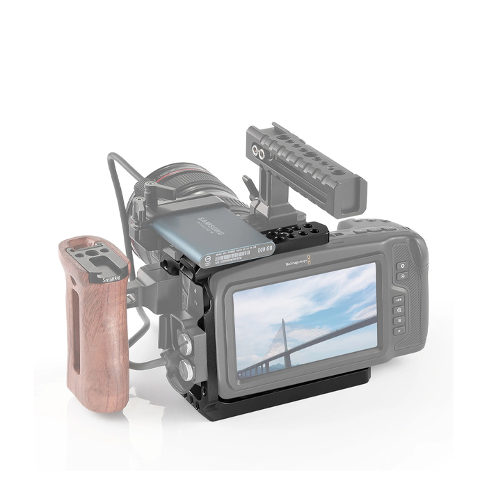 SmallRig Half Camera Cage for Blackmagic Design Pocket Cinema Camera 4K & 6K 2254 is a form-fitting cage. It is securely locked to the camera by 1/4’’-20 screws on the top and bottom, with additional locating pins and rubber pads on the base plate preventing wiggles and scratches. On the top and left side are built-in NATO rails, where you can attach SmallRig NATO Top Handle 1955 and SmallRig Wooden NATO Side Handle 2187 to conduct hand-held shooting. Multiple mounting points such as 1/4’’-20 & 3/8’’-16 threaded holes, cold shoe and ARRI locating holes are perfect for attaching accessories. For users who record SmallRig Samsung T5 SSD Mount 2245 is a good choice. The cage is compatible with SmallRig HDMI & USB-C Cable Clamp 2246 to fix the cables. It works with SmallRig Lens Mount Adapter Support 2247 to keep your lens stable.