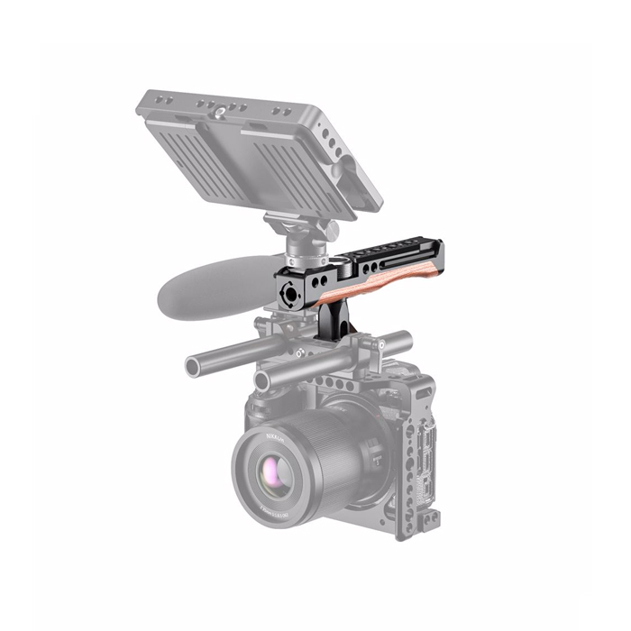 SmallRig Rotating Nato Clamp Handle HTN2362 is designed to provide a comfortable handheld use and mounting threads for accessory such as monitor, microphone and light. The quick release handle can rotate 360 degrees and secures to any cage with nato rail on the top or side. The handle features multiple 1/4"-20 and Arri 3/8"-16 threaded holes for accessory attachment, such as Monitor Mount BSE2294, BSE2348 and Magic Arm 2115. Additionally, it features cold shoe mount for microphone, light or sound receiver, the cold shoe in front features anti-off button to protect your setup from slipping off. The handle integrates with wooden material to make it more comfortable to use.