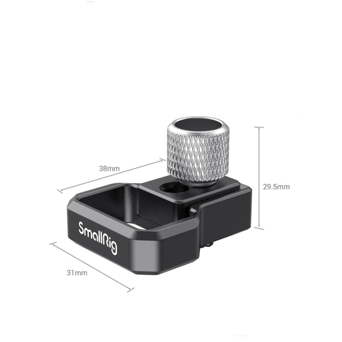 SmallRig 3000 HDMI Cable Clamp is compatible with SmallRig Cage 2999 and 3667. Designed to prevent the camera's HDMI cable from accidentally disconnecting, this clamp attaches to the side of the cage using a 1/4"-20 screw and two anti-twist pins. The easy-to-grasp Knurled 1/4"-20 screw adjusts a sliding block that can be tightened to accommodate HDMI cable of varying diameters. This Cable Clamp is constructed of a sturdy aluminum alloy and comes with an Allen wrench.