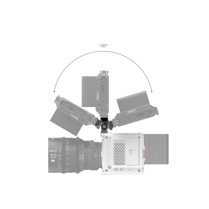 SmallRig EVF Monitor Mount for RED KOMODO 3045 connects monitors via one 1/4”-20 screw and connects KOMODO or cages via two 1/4”-20 screws. It tilts 170 degrees, swivels 360 degrees, and can be stopped at any angle with a load capacity of 1.5kg while the tightness is adjustable on each axis. Its top and bottom come with silicone paddings to prevent scratching and increase friction. It features 1/4”-20 holes, available for mounting other accessories at will.