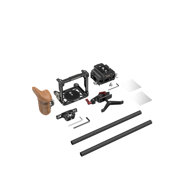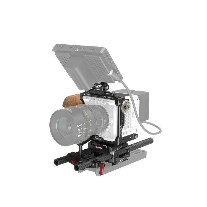 SmallRig Master Kit for KOMODO 3208 includes a form-fitting full cage to protect the camera. Its baseplate supports ARRI-type quick release plate, allowing easy adjustment for center of gravity while shooting; its built-in Manfrotto quick release plate enables quick switch between handheld shot and tripod shot. The wooden grip made of rosewood is ergonomically designed for better grip experience. The monitor mount locks the monitor perfectly and can be swiveled 360° and tilted 170°.