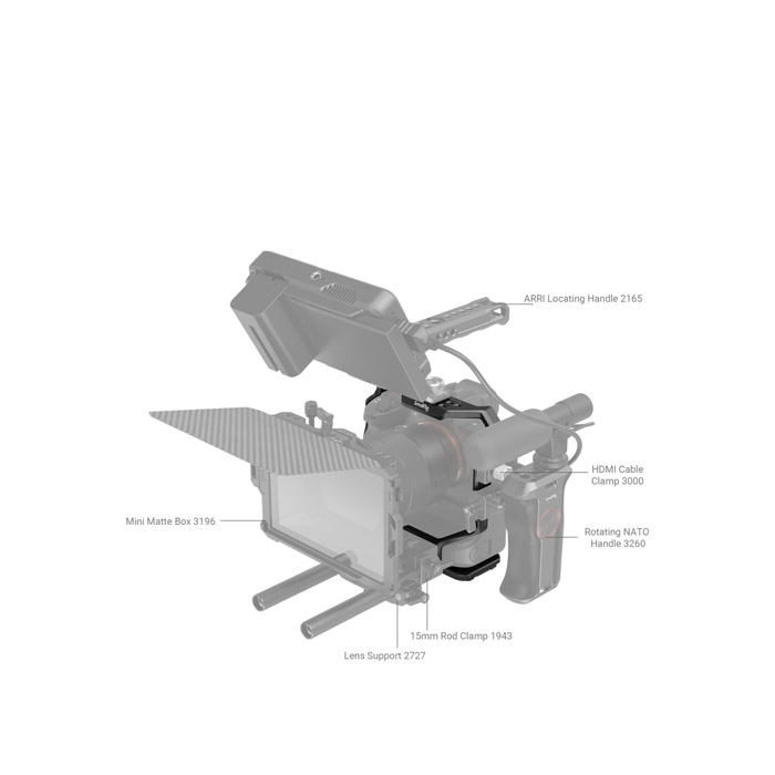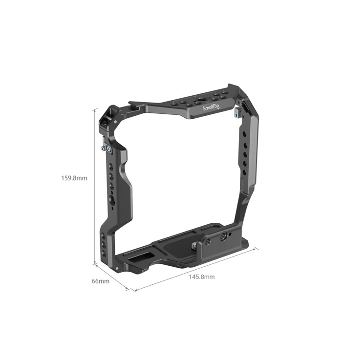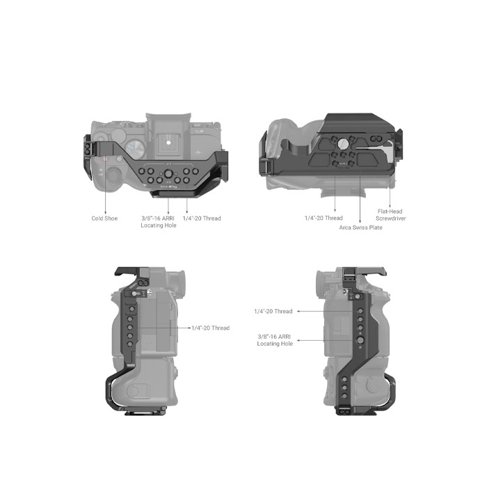 SmallRig Cage for Sony Alpha 7S III/Alpha 7 IV/Alpha 7R IV/Alpha 1 with VG-C4EM Battery Grip 3594 is designed to protect the camera and provide accessory mounts. Secured by one 1/4''-20 screw at the bottom and two side lock adapters via the shoulder strap holes on each side. The cage maintains access to buttons, card slots, battery door, and flip screen. Featuring 1/4''-20 threaded holes and ARRI 3/8"-16 locating holes to attach Top Handle 1638 and 2165 for a low-angle shot, Monitor Mount 2174 and 2903 as well as Side Handle 2093. Cold shoe mount on the top supports microphones or LED lights, and NATO rail on the left fits NATO Handle 3323 and 3260.