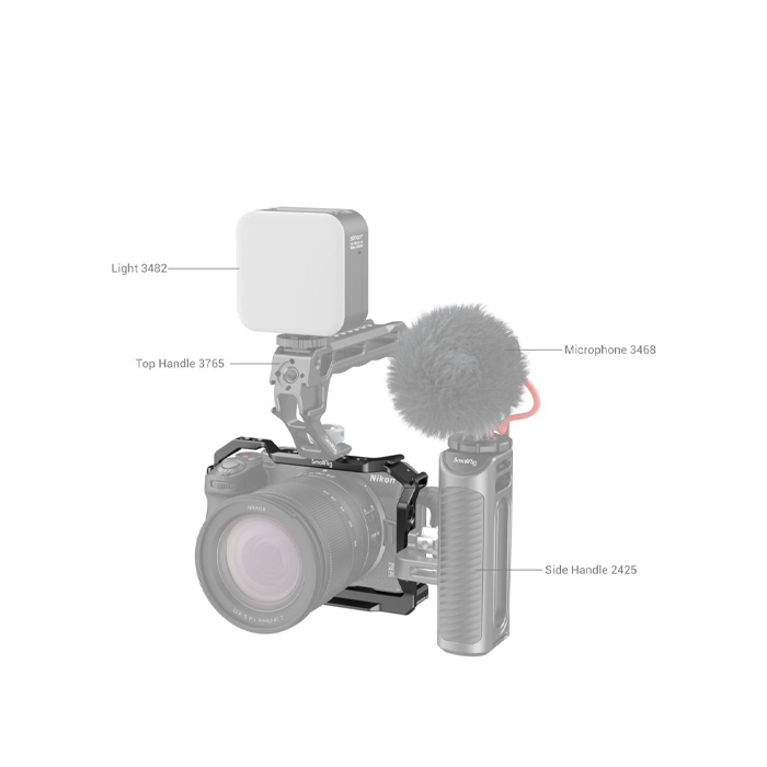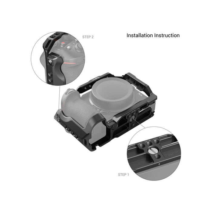 SmallRig Cage for Nikon Z 30 3858 is designed to provide protection and accessory mounts. Securing the camera via a 1/4"-20 screw and a side lock adapter on the right, the cage has silicone cushions that prevents scratches and maintains full access to all buttons, interfaces, the flip screen, etc. It also comes with a hinge arm at the battery door that fits camera curve for a comfortable grip and facilitates battery replacement. 1/4"-20 threaded holes and ARRI 3/8"-16 locating holes for Top Handle HTS2756, 3765, Side Handle HSS2425, 3814, HDMI Cable Clamp 1822; and a cold shoe mount on the top for microphone and LED light for Vlogging. An Arca-Swiss quick plate at the bottom supports Arca-Swiss tripod and DJI RS 2 / RSC 2 / RS 3 / RS 3 Pro stabilizer for quick switch among tripod, stabilizer and handheld modes. In addition, a magnetic double-ended wrench at the bottom is available to assemble and disassemble for your convenience.
