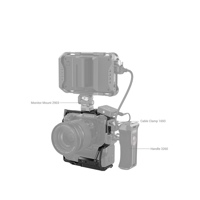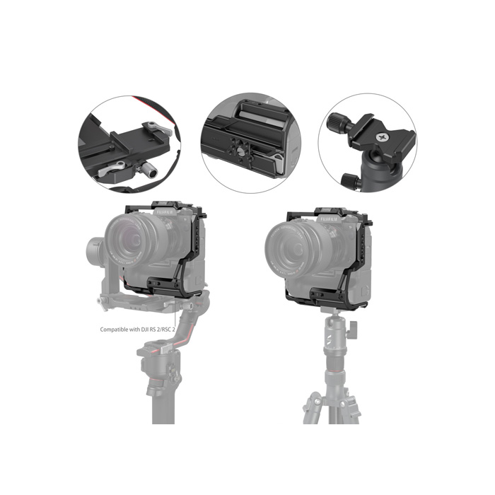 SmallRig Multifunctional Cage for FUJIFILM X-H2 and X-H2S with FT-XH/VG-XH Battery Grip 3933 is designed to protect the camera and provide varied mounting points. It locks the camera via one 1/4''-20 screw at the bottom and two side lock adapters, also features several rubber cushions to prevent scratches. The cage gives full access to buttons, card slot, battery door, and flip screen. It comes with 1/4 "-20 and 3/8"-16 threaded holes for Top Handle 2165 & 1638, Side Handle 2093 & 2425, HDMI Cable Clamp 1693 for stable data transmission, Monitor Mount 2903 & 2904 for attaching monitor, Magic Arm 2115. Two cold shoe mounts for microphones, LED lights, etc. Its bottom Arca-Swiss quick release plate supports Arca-Swiss tripod and DJI RS 2/RSC 2 for quick switch among handheld, stabilizer, and tripod shootings. On its front, there are two 1/4"-20 threaded holes that are compatible with 15mm Rail Block v3 942 for such accessories as Matte Box 3196 and Lens Support 2152 and one 1/4 "-20 locating hole that supports Single Rod Clamp 3276 for follow focus 3010. A built-in flat-head screwdriver is available to facilitate assembly and disassembly.