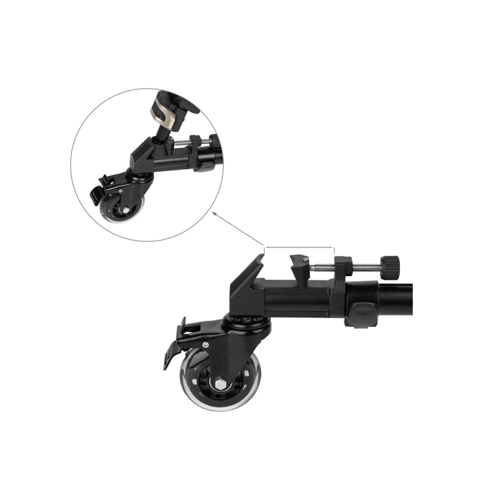 SmallRig Universal Tripod Dolly 3986 is a universal accessory specially designed to move tripod and facilitate action photography. Its large and highly adaptive wheels can deal with complex terrains and have locking parts to avoid displacement due to uneven ground or collision. Extendable legs, which extend from 298mm to 435mm, make it compatible with different tripods in any opening and closing angles. This foldable and easy-to-store tripod dolly also comes with a handle and a carrying bag for easy transfer.