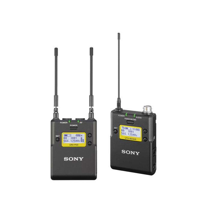 The package includes the UTX-B03 belt-pack transmitter and URX-P03 portable receiver. Also included is a high quality omni-directional lavalier microphone and a range of accessories including windscreen, microphone holder clip, belt-clip and shoe-mount adaptor.