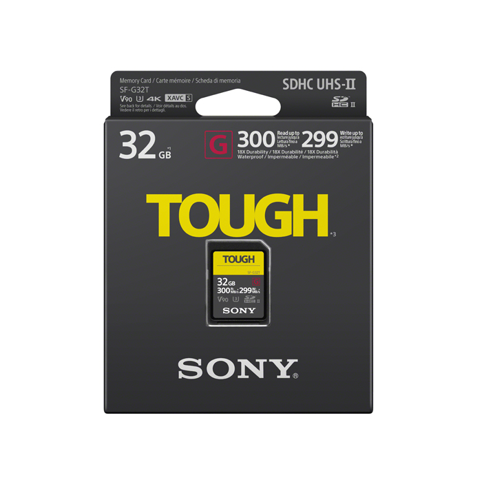 Sony SF-G kort serien med TOUGH-specifikation er designet til at være pålidelige. Kortet er støbt i ét stykke med særdeles hårde materialer og er 18 gange mere modstandsdygtig mod bøjning end standard SD-kort. SF-G kortene fra Sony er modstandsdygtig over for stød ved fald fra op til 5 meter og har det højeste niveau af støv- og vandtæthed (IP68).