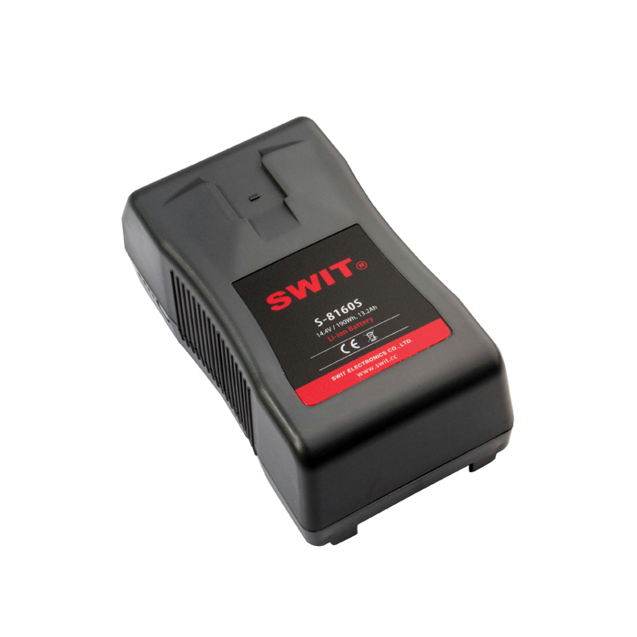 S-8160S is the standard SONY V-mount connection and adopts a metal V-wedge that ensures reliable mounting. A D-tap DC output socket is equipped on the top side of S-8160S Battery for 14.4 VDC connection, such as on-camera lights, monitors, wireless transmitter, etc. The Maximum Power from D-tap is 100W, 8A. On the side of the battery, 4-level LED power indicators give a quick view of the remaining battery capacity.